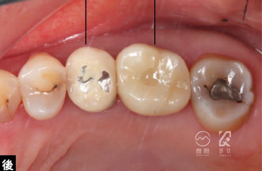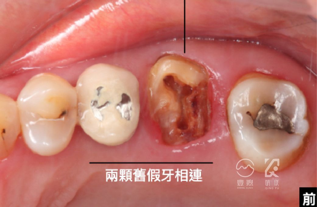 病人原先是兩顆假牙相連在一起,在不易清潔的狀態下,第一大臼齒開始蛀牙,慢慢的導致假牙鬆脫,讓牙齒斷裂。經過仔細評估,建議病人前一顆舊假牙修復好可以再繼續使用,後面這顆斷裂的大臼齒則是建議拔除且植牙。